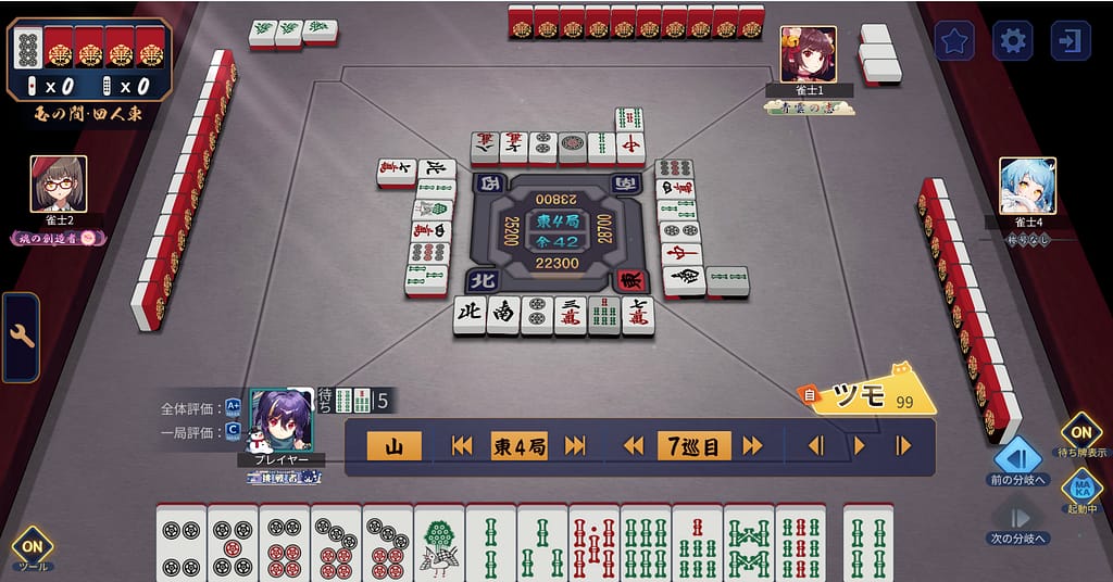 立直しとけば一発だった!!とんでもない4s持って来てしまう。運のみでマンガンツモってトップになった!たしかにMAKA評価Cも納得。それぞれの分岐でテキトーしているわけではなく、うんうん悩んだ選択の連続ではあった。どっちの選択もアリって思えるし、カン6sツモったからアレだけどホンマにあそこで立直かはいまだに疑問。