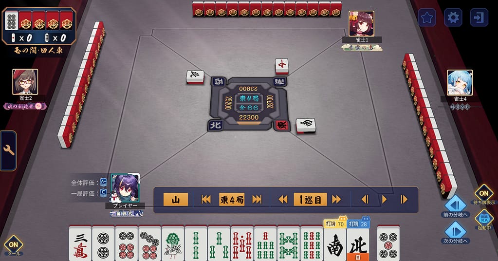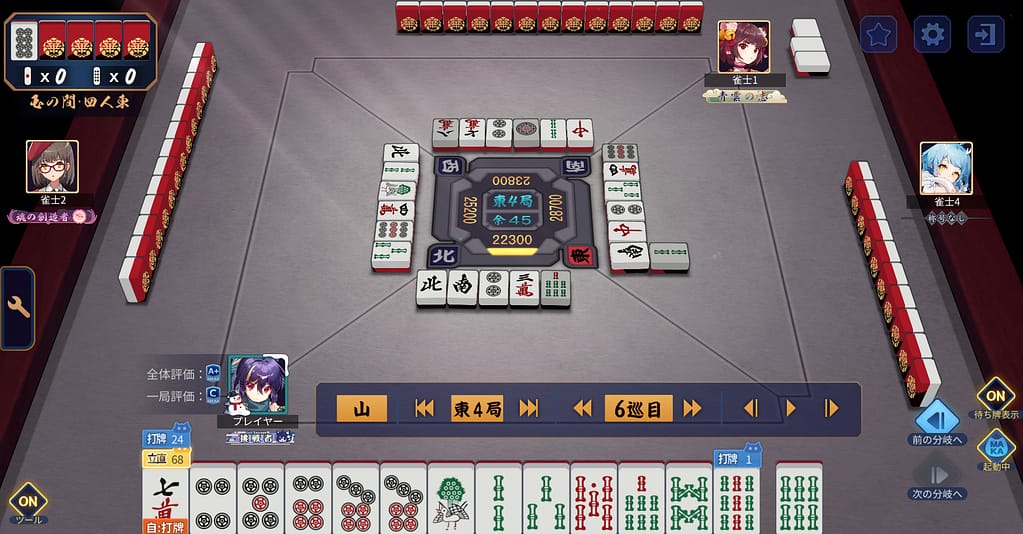ラス→トップで実質200ポイントだ!・・・と思ったらなんか評価Cとかついたので各巡目の判断基準を記録。カン6sの2600を即立直の選択はあったけど、今でも正直よく分からない。そういうわけで1巡目から。