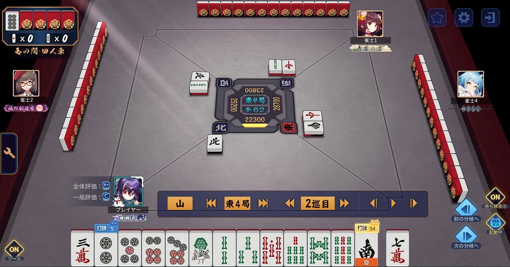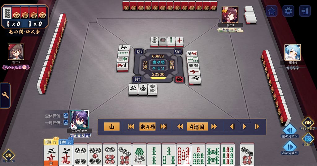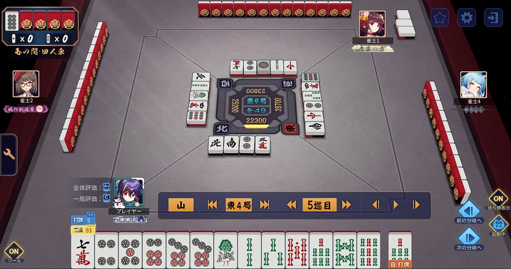 立直しとけば一発だった!!とんでもない4s持って来てしまう。運のみでマンガンツモってトップになった!たしかにMAKA評価Cも納得。それぞれの分岐でテキトーしているわけではなく、うんうん悩んだ選択の連続ではあった。どっちの選択もアリって思えるし、カン6sツモったからアレだけどホンマにあそこで立直かはいまだに疑問。