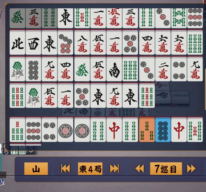 というわけで保留の7s。7mで平和ができれば立直、4sツモもあるし。いやでも、どうせ愚形ならカン6sでいいのか?う~ん・・・。